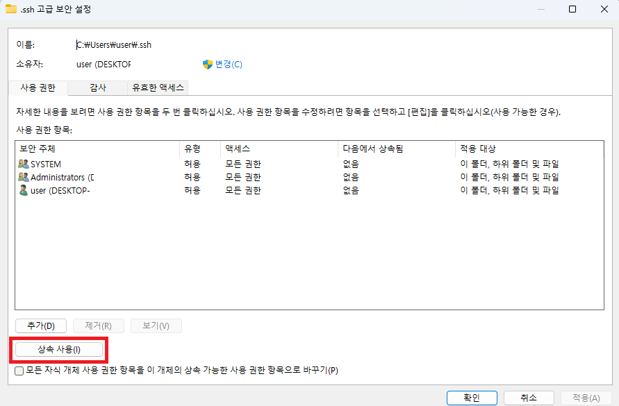 위 그림 처럼 상속 사용으로 나오게 만들고, 알수 없는 사용 권한이 있으면 삭제 -> 적용