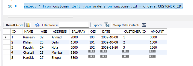 이때 ON 절의 조건을 만족하지 않는 경우에는 첫 번째 테이블의 필드 값은 그대로 가져오고