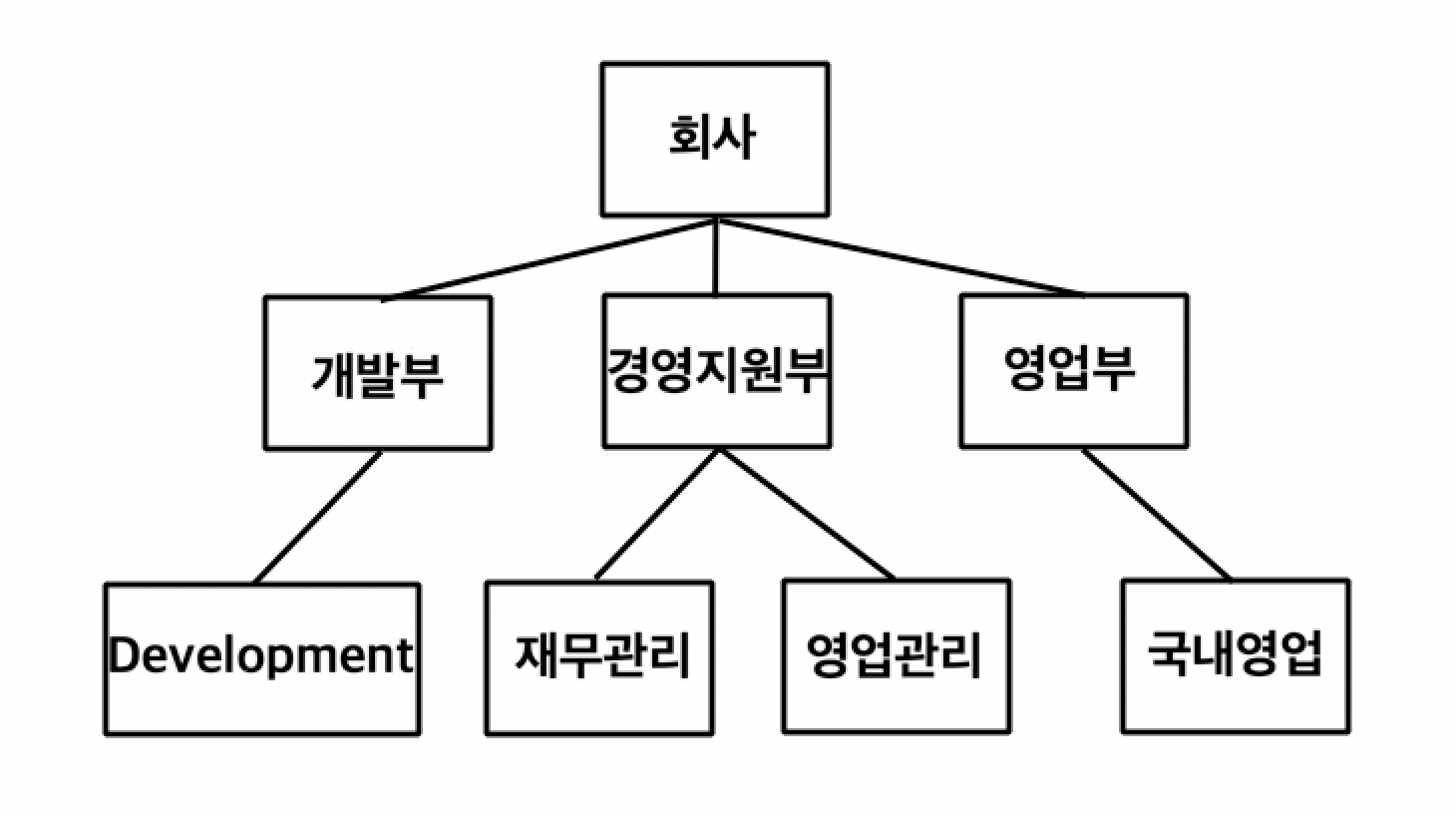 '회사'는 최상위계층이고, 회사를 중심으로 개발부, 경영지원부, 영업부 세 부서로 나뉜다.