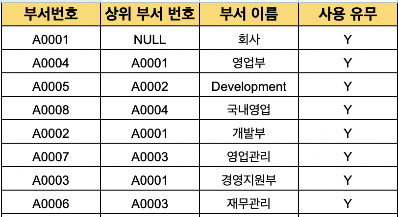 회사는 그보다 상위부서가 없기 때문에 상위부서를 NULL로 주며, 부서번호가 NULL 인 것을 찾으면