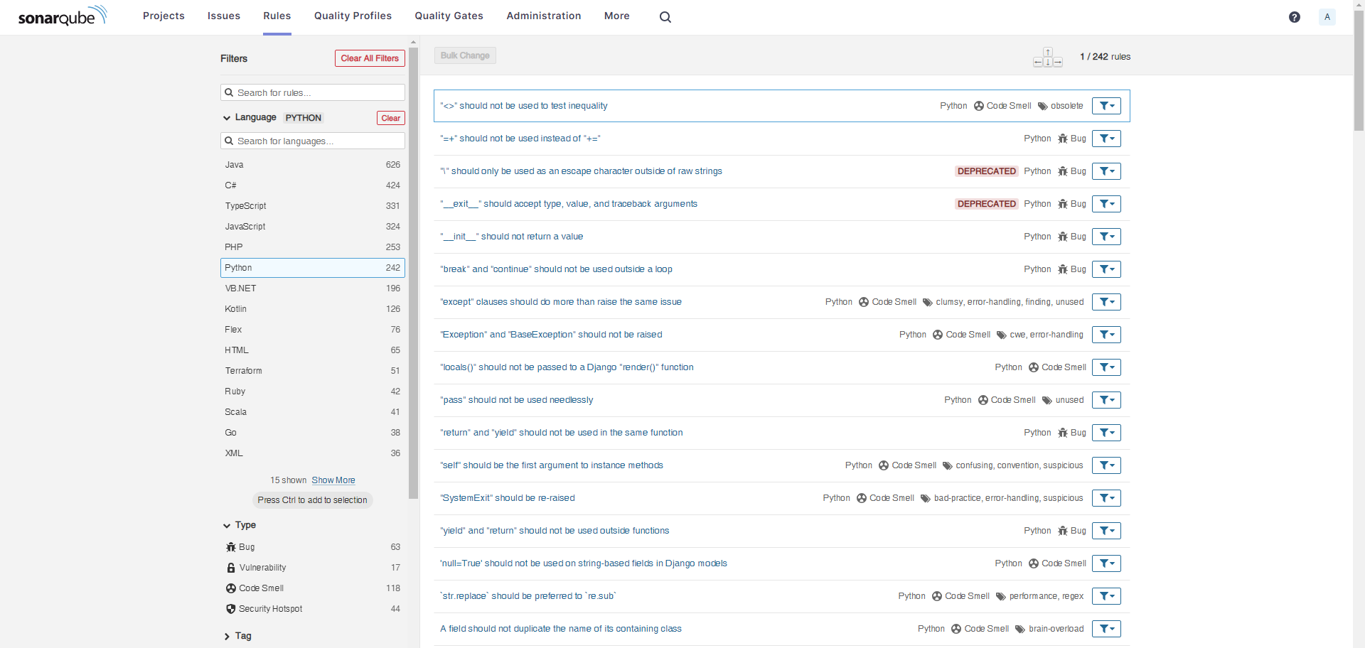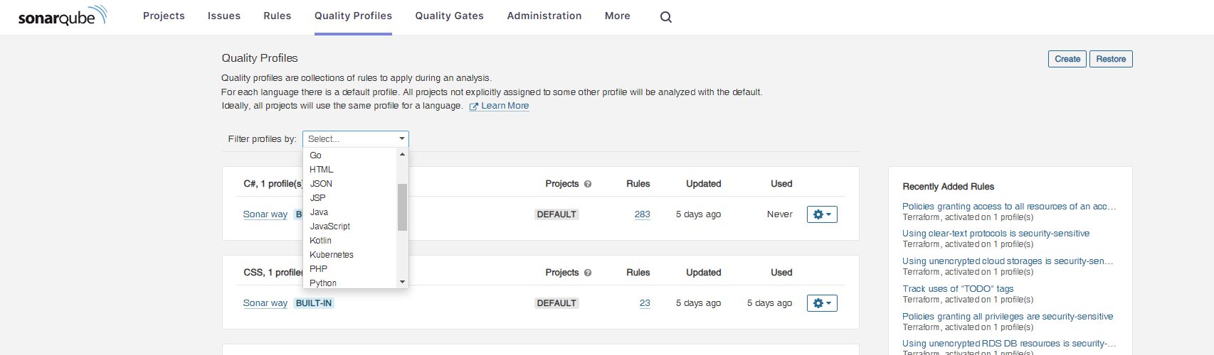 이러한 Rule 모음을 하나의 프로필로 만든 것도 Quality Profiles (해당 언어에 맞는 default Rules 템플릿) 에서 확인된다.